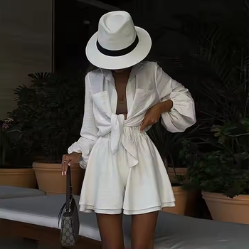 Summer Beach 2 Piece Outfits for Women Long Sleeve Button Down Shirts and Flare Shorts Ladies Sweet Set