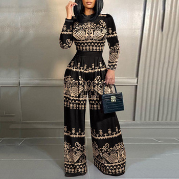 Hot Selling Retro Print Plus Size One Piece Jumpsuit Women Slim Fit Printed Long Sleeve Wide Leg Jumpsuit