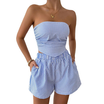 เซ็ต2ชิ้นพิมพ์ลายทางของผู้หญิงชุดเสื้อกล้ามจับจีบชุดแฟชั่นมีกระเป๋าสำหรับฤดูร้อน2025
